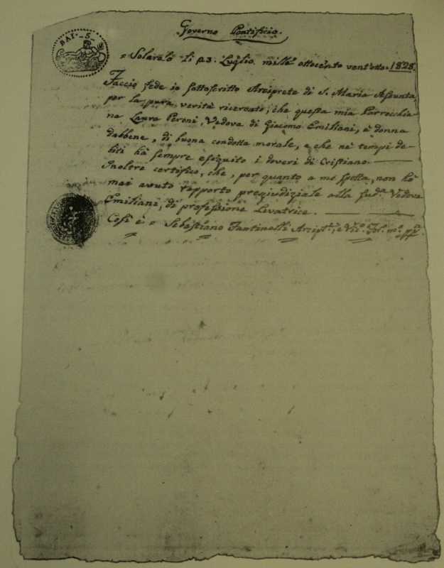 Certificato di buona condotta rilasciato dal parroco ad un'aspirante levatrice [Sanlorenzo, 1988, p. 155]