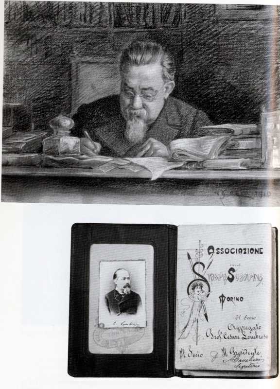 Cesare Lombroso al tavolo di lavoro, pastello 1910. Sotto: tesserino di giornalista di Cesare Lombroso, s.d.. [Frigessi, 2003]
