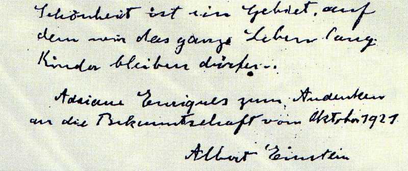 Aforisma scritto da Einstein nel diario di Adriana, in ricordo del loro incontro. [Per cortese permesso del Prof. Andrea De Benedetti, Torino].