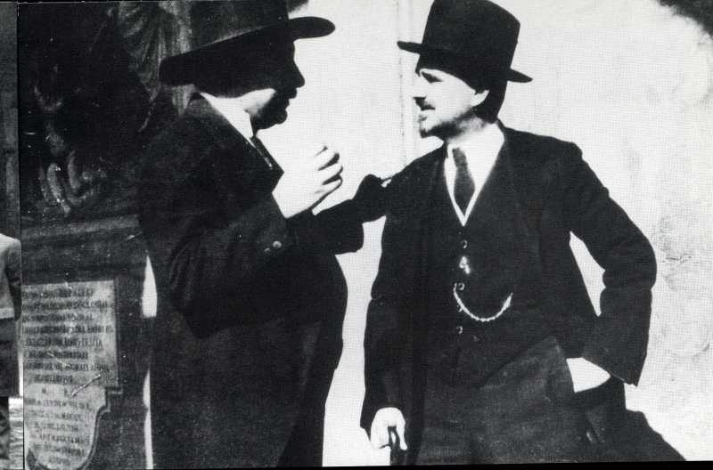 Albert Einstein e Federigo Enriques nelle logge dell'Archiginnasio di Bologna. [G. Enriques, 1983, p. 23].