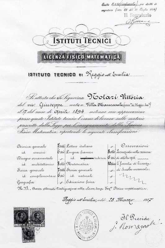 Licenza fisico-matematica di Notari Vittoria, Istituto tecnico, Reggio Emilia (2), [Archivio sorico dell'Università di Bologna].
