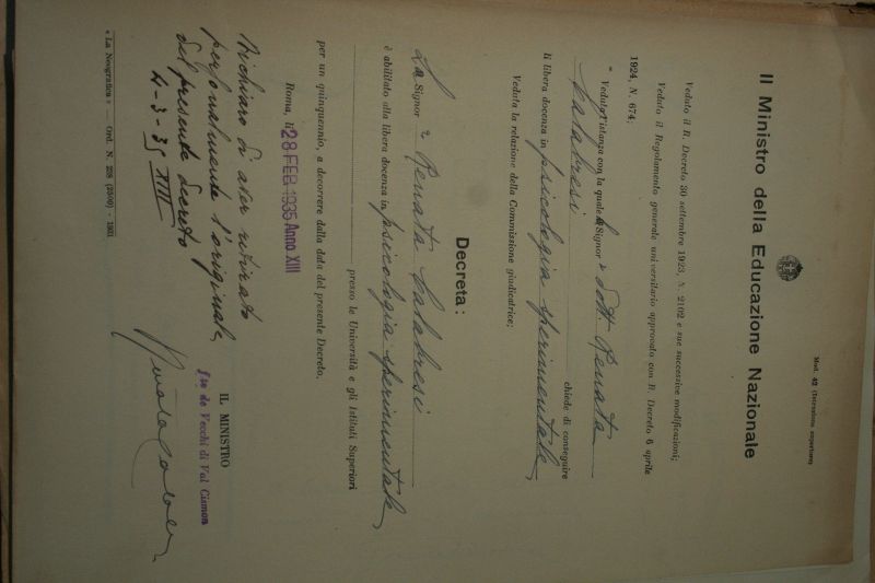 Abilitazione alla libera docenza in psicologia sperimentale, 28 febbraio 1935 [ACS]