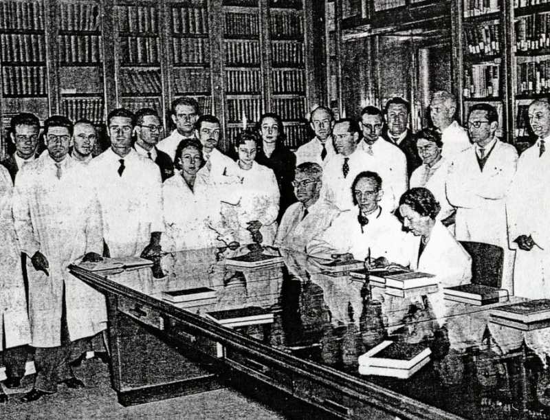 Daniel Bovet con i collaboratori nella Biblioteca del laboratorio di chimica terapeutica nel 1957. Alla sua sinistra Filomena Nitti. [Bignami, 1993, p. 49]
