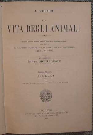 Frontespizio di 'La vita degli animali' di Alfred Brehm, 2a edizione italiana Traduzione di M. Lessona. Torino 1893.