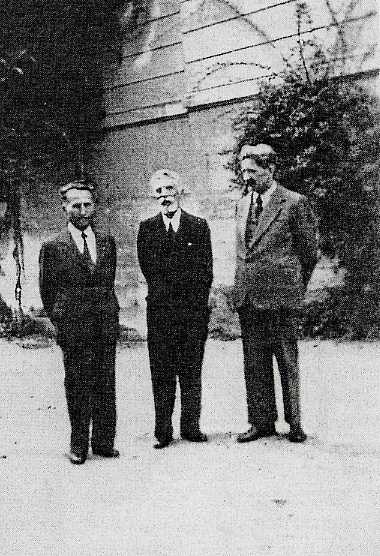 Nel giardino dell'Università clandestina di Roma, i prof.: G. Castelnuovo (al centro), G. Bisconcini (a destra), R. Lucaroni (a sinistra). [E. Castelnuovo, 2001, p. 67].