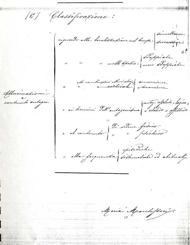 Schema sulla classificazione all'interno della tesi di Maria Montessori: 'Contributo clinico allo studio delle allucinazioni a contenuto antagonistico; discussa il 10 Luglio 1896.