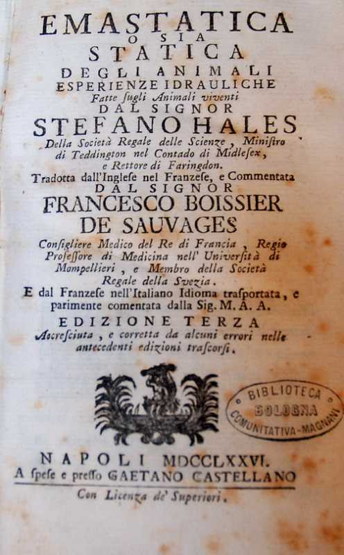 Emastatica ossia statica degli animali, del Signor Stefano Hales, tradotta in italiano da Maria Angela Ardinghelli.
