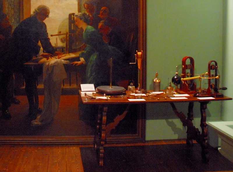 GLi strumenti utilizzati da Galvani, esposti a Palazzo Poggi davanti al quadro di Antonio Muzzi.