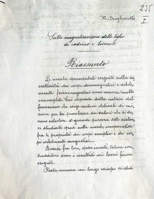 Frontespizio del 'Riassunto della tesi di laurea'. [Archivio storico dell' Università  di Padova].