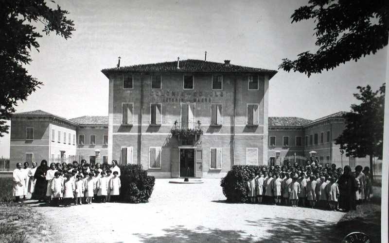Fotografia scattata all'esterno della Colonia Antonio Marro; la dott.ssa è ritratta alle spalle del gruppo delle bambine [Archivio privato].